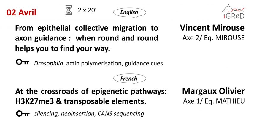 EventsiGReD Tuesday : Vincent Mirouse & Margaux OlivierHome › Events › iGReD Tuesday : Vincent Mirouse & Margaux Olivier2 April 202412:45Amphi Limagne, CRBC Building, Medical School Add to my calendar