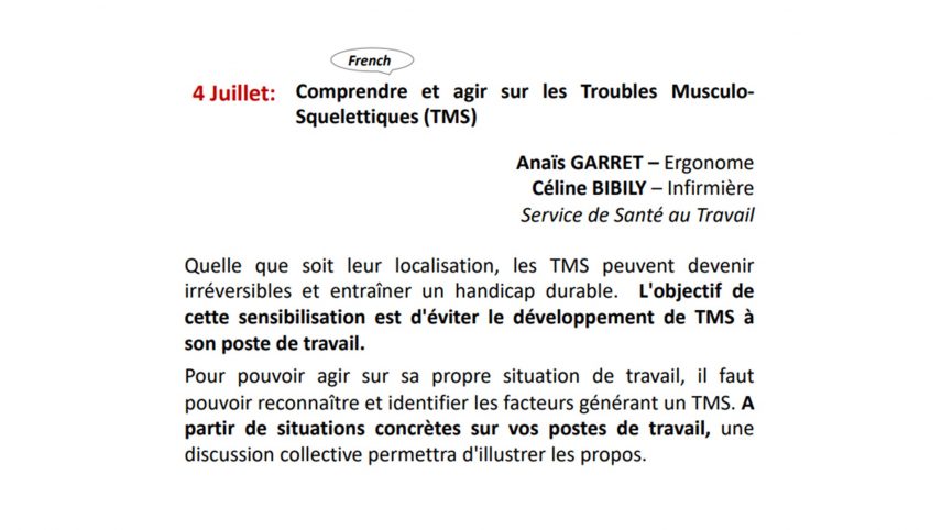 AgendaMardi de l’iGReD : Anaïs GARRET (Ergonome) & Céline BIBILY (Infirmière) – Service de Santé au TravailAccueil › Agenda › Mardi de l’iGReD : Anaïs GARRET (Ergonome) & Céline BIBILY (Infirmière) – Service de Santé au Travail4 juillet 202312:45Amphi VOLCAN –CRBC – Site Dunant Ajouter à mon agenda