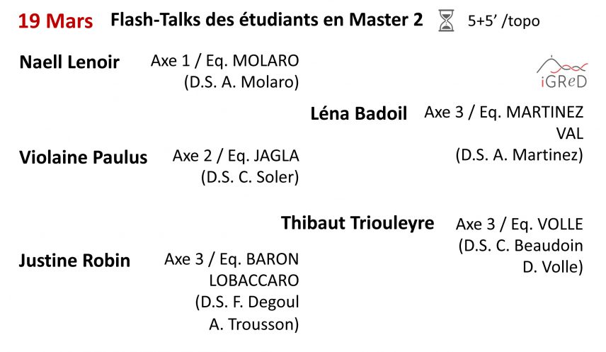 AgendaMardi de l’iGReD: Flash-Talks des étudiants en Master 2Accueil › Agenda › Mardi de l’iGReD: Flash-Talks des étudiants en Master 219 mars 202412:45Amphi Limagne Bat CRBC, Site Dunant Ajouter à mon agenda
