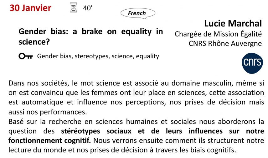 AgendaMardi de l’iGReD: Lucie Marchal- Chargée de mission égalité CNRS Rhône AuvergneAccueil › Agenda › Mardi de l’iGReD: Lucie Marchal- Chargée de mission égalité CNRS Rhône Auvergne30 janvier 202412:45Amphi Limagne, CRBC building , Medical school campus Ajouter à mon agenda